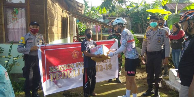 Saat melewati Desa Moyag Todulan Kecamatan Kotamobagu Timur, rombongan Gowes Polda Sulut menyempatkan memberikan bantuan sosial untuk meringankan beban masyarakat yang terdampak wabah Covid-19 kepada 25 kepala keluarga dan diserahkan langsung oleh Kapolda Sulut.