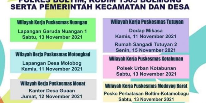Kepala Dinkes Boltim, Eko Marsidi saat dijumpai oleh awak media Senin 8 November 2021 mengatakan, kegiatan vaksin masal tersebut akan digelar di tiap Puskesmas yang ada diwilayah Boltim.