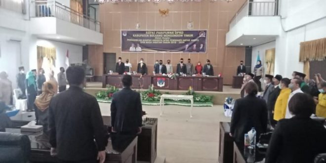 JM.com-Dewan Perwakilan Rakyat Daerah (DPRD) Kabupaten Bolaang Mongondow Timur (Boltim), Jumat (7/1/2021) menggelar rapat paripurna pengambilan sumpah anggota DPRD Pengganti Antar Waktu (PAW) sisa masa jabatan tahun 2019-2024, antara anggota DPRD sebelumnya Almarhum Suradi Ridwan Simbala, digantikan oleh Hi. Soenardy Soemanta.Paripurna istimewa ini di pimpin langsung Ketua DPRD Fuad Landjar, serta dua pimpinan DPRD Medy Lensun dan Muhamad Jabir. Paripurna ini juga dihadiri langsung Bupati Boltim Sam Sachrul Mamonto dan Wakil Bupati Oskar Manoppo, juga turut hadir mantan Bupati dua periode Bolaang Mongondow Raya (BMR) Hj. Marlina Moha Siahaan, Pimpinan pimpinan KPU Boltim, Bawaslu Boltim, Wakapolres Boltim, Perwira Penghubung, Kepala Bank Sulut Gorontalo, Hi. Tun Emir Sumba, Anggota DPRD Sulut dari Rasky Mokodompit, Kantor Pertanahan Boltim, dan Kepala SKPD lingkup Boltim.
