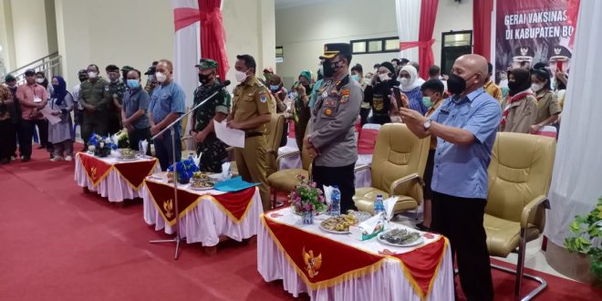 JM.com,Boltim-Bupati Bolaang Mongondow Timur, Sam Sachrul Mamonto, S.Sos, M.Si bersama Kapolres Boltim dan Pabung Dandim 1303, Asisten II beserta jajaran SKPD menghadiri pelaksanaa vaksinasi yang digelar di Kantor Bupati Boltim, Tutuyan, Jumat, 25/02/22,