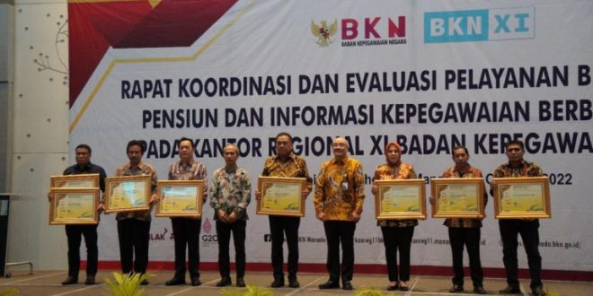 Piagam penghargaan diserahkan langsung Kepala BKN Bima Haria Wibisana kepada Bupati Boltim melalui Asisten III, Rusmin Mokoagow, di sela kegiatan Rakorev pelayanan bidang mutasi, pensiun dan informasi kepegawaian berbasis digital pada kantor regional XI BKN, Rabu 12 Oktober 2022.