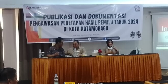 JM.Com Kotamobagu-Badan Pengawas Pemilu (Bawaslu) Kota Kotamobagu. Melakukan sosialisasi publikasi dan dokumentasi pengawasan penetapan hasil pemilu tahun 2024 di kota Kotamobagu bertempat di hotel Sutan Raja Senin (22/4/2024)
