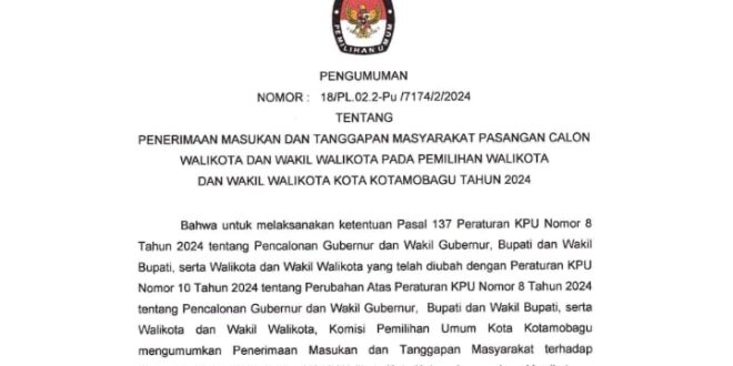 Bahwa untuk melaksanakan ketentuan Pasal 137 Peraturan KPU Nomor 8 Tahun 2024 tentang Pencalonan Gubernur dan Wakil Gubernur, Bupati dan Wakil Bupati, serta Walikota dan Wakil Walikota yang telah diubah dengan Peraturan KPU Nomor 10 Tahun 2024 tentang Perubahan Atas Peraturan KPU Nomor 8 Tahun 2024 tentang Pencalonan Gubernur dan Wakil Gubernur, Bupati dan Wakil Bupati, serta Walikota dan Wakil Walikota, Komisi Pemilihan Umum Kota Kotamobagu mengumumkan Penerimaan Masukan dan Tanggapan Masyarakat terhadap Pasangan Calon Walikota dan Wakil Walikota Kota Kotamobagu.