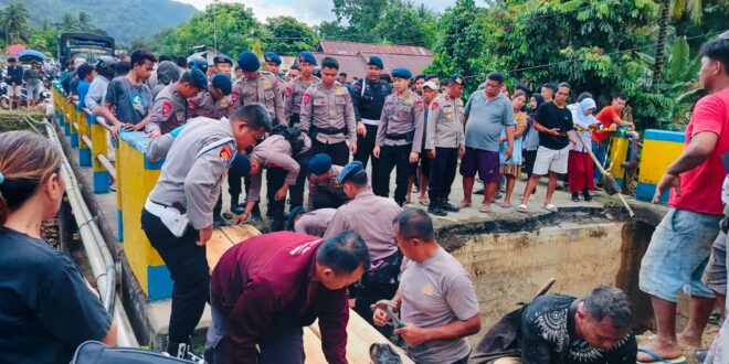 ke esokan harinya Senin (9/9/2024) personil Polsek Passi Polres Kotamobagu, dan personil Brimob Kompi B Inuai membuata jembatan darurat memasang papan sebagai jembatan untuk dilalui oleh kendaraan sepeda motor.