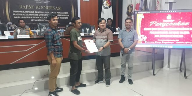 Komisi pemilihan umum KPU kota Kotamobagu menyerahkan surat keputusan penetapan pasangan calon tersebut, kepada LO pasangan calon masing masing
