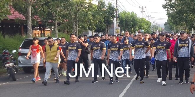Jurnal Mongondow.Net-Rangkaian Hari Bayangkara Ke-79 Polres Kotamobagu melaksanakan olah Raga Jalan Sehat yang di ikuti Forum Kominikasi Perangkat Daera (Forkopimda) dan Masyarakat kota kotamobagu. Menariknya dalam kegiatan jalan sehat tersebut. Di hadiri dan di ikuti Gubernur Sulawesi Utara Mayjen (Pur) Yulius Selvanus jalan s tersebut menempu rute seputra kota kotamobagu yang di mulai pada Titik Star Depan Markas Komando (Mako) Polres kotamobagu dan kemabli Finis pada Titik star Awal. Gubernur sulut saat sabutan mengatakan kegiatan ini peting di laksanakan sebap bagian dari Kesehatan.” Kegiatan semacam ini, peting sering dilakukan, kita bangun pagi pagi menghirup udara segar dan berolah raga ringan seperti ini ingant sepeti kata bijak mensana in corpore sano di dalam tubuh yang sehat terdapat jiwa yang kuat.” Ucap Pak Gub Yulius Selvanus