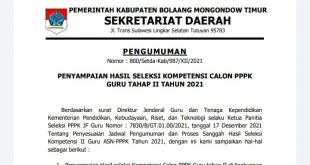 JM.Com, Boltim-Pemerinta kabupaten bolaang mongondow timur mengeluarkan surat pengunguman hasil seleksi kompentensi calon pegawai pemerinta dengan perjanjian kerja (PPPK) guru tahap II tahun 2021. Surat pengungunam yang bernomor 800/setda-kab/987/XII/2021 itu, …