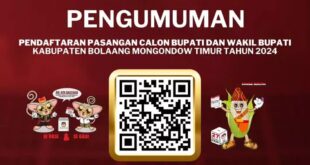 JM.Net,Boltim-Komisi Pemilihan Umum (KPU) Kabupaten Bolaang Mongondow Timur (Boltim), mengumumkan Pendaftaran Pasangan Calon Bupati dan Wakil Bupati Kabupaten Boltim tahun 2024, berdasarkan ketentuan pasal 95 ayat (1) Peraturan KPU Nomor …
