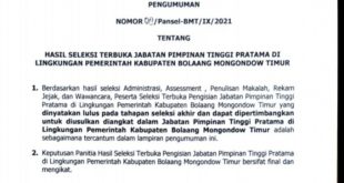 JM.com- BOLTIM,Panitia seleksi (Pansel) terbuka Jabatan Pimpinan Tinggi (JPT) Pratama Kabupaten Bolaang Mongondow Timur (Boltim) mengumumkan nama-nama peserta hasil seleksi JPT di lingkungan Pemerintah Kabupaten Boltim, pada Selasa 28/09/21 di …